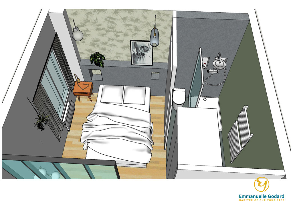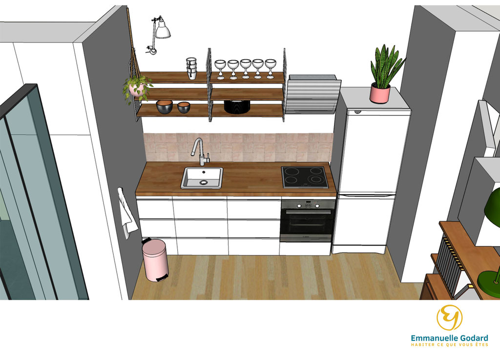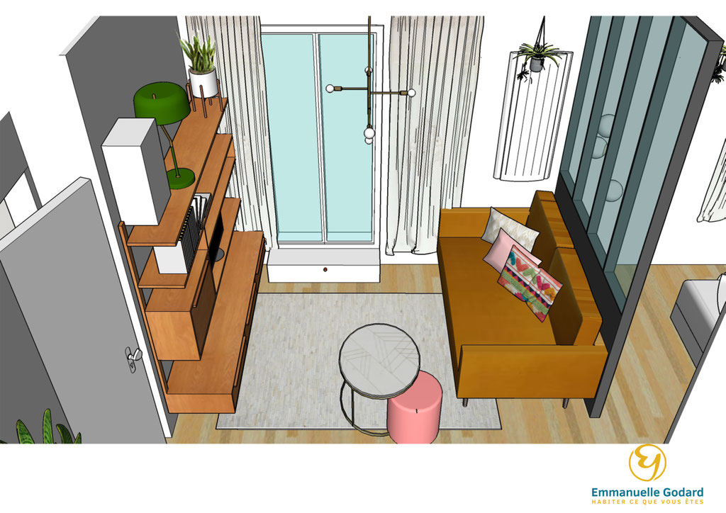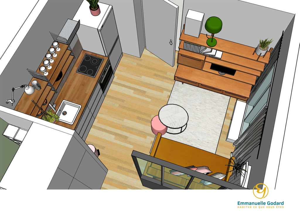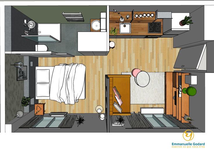 J'ai donc repensé l'aménagement complet de ce petit deux pièces en intégrant une cuisine, un salon, une chambre et une salle de bain attenante.