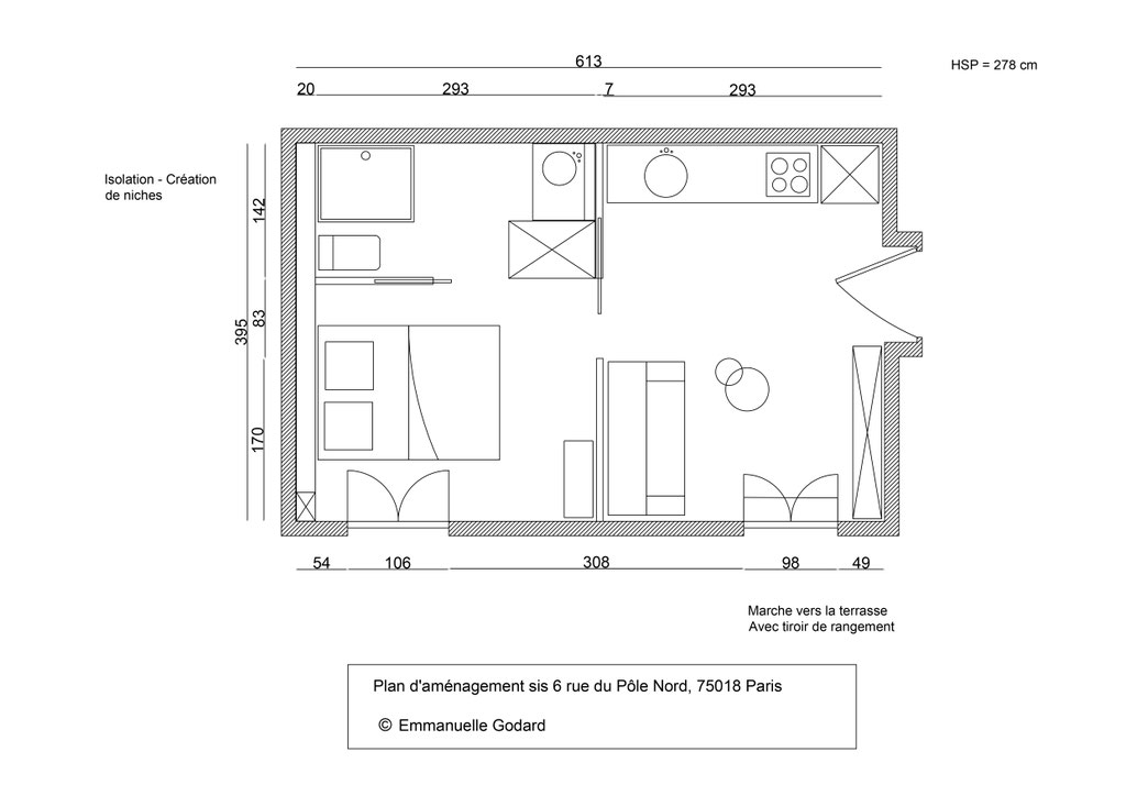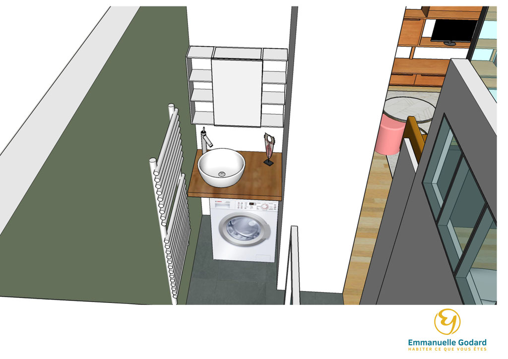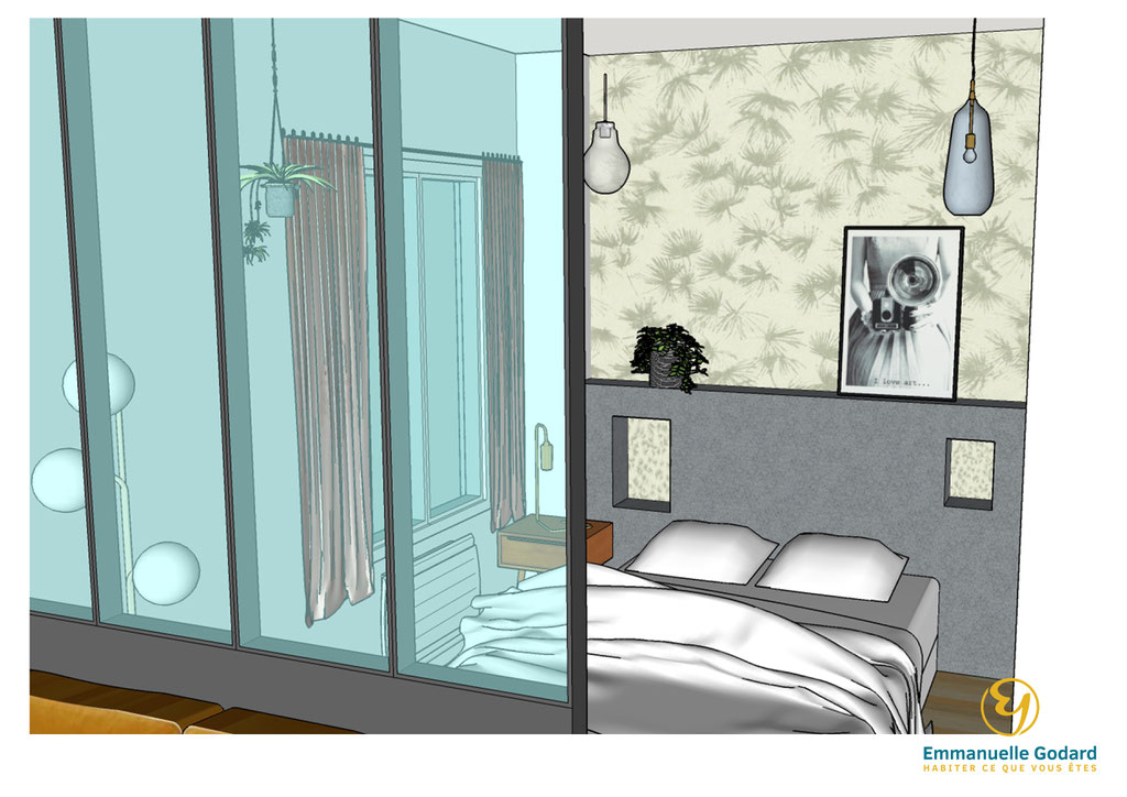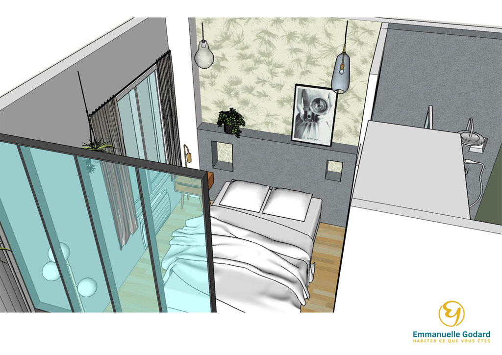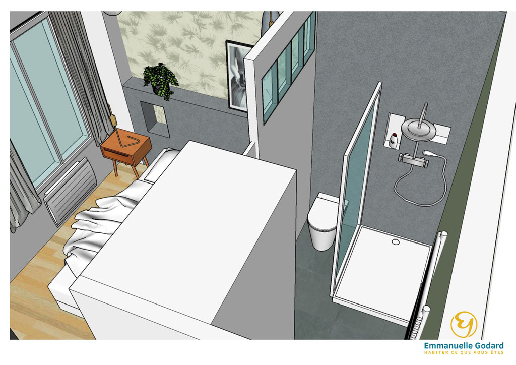 J'ai donc repensé l'aménagement complet de ce petit deux pièces en intégrant une cuisine, un salon, une chambre et une salle de bain attenante.