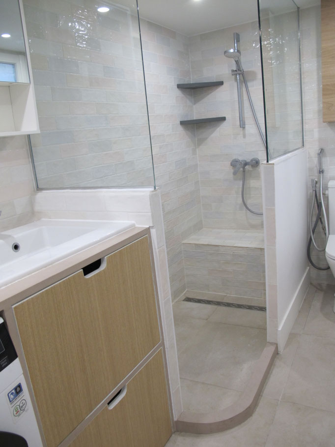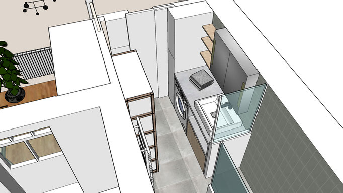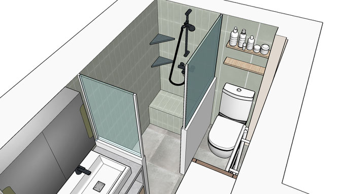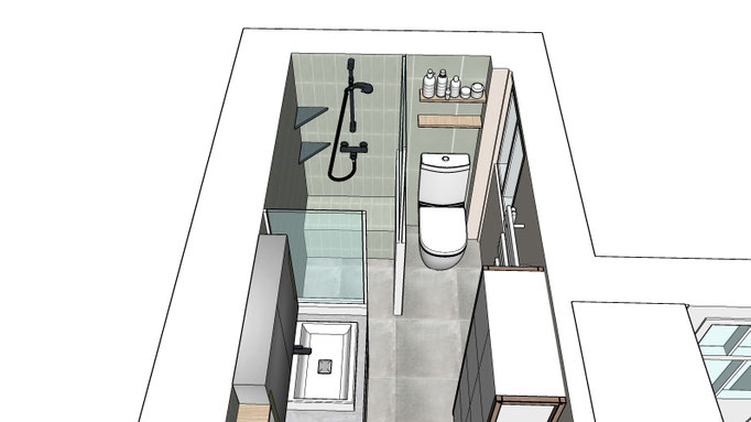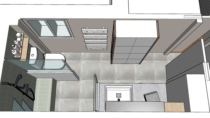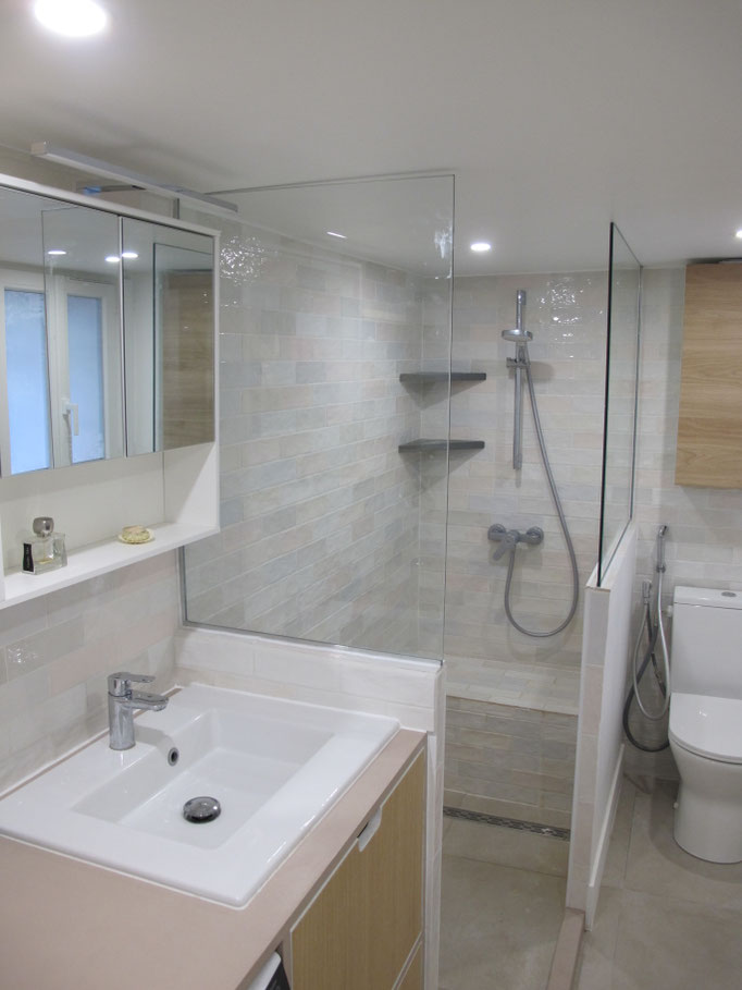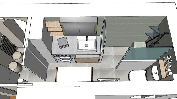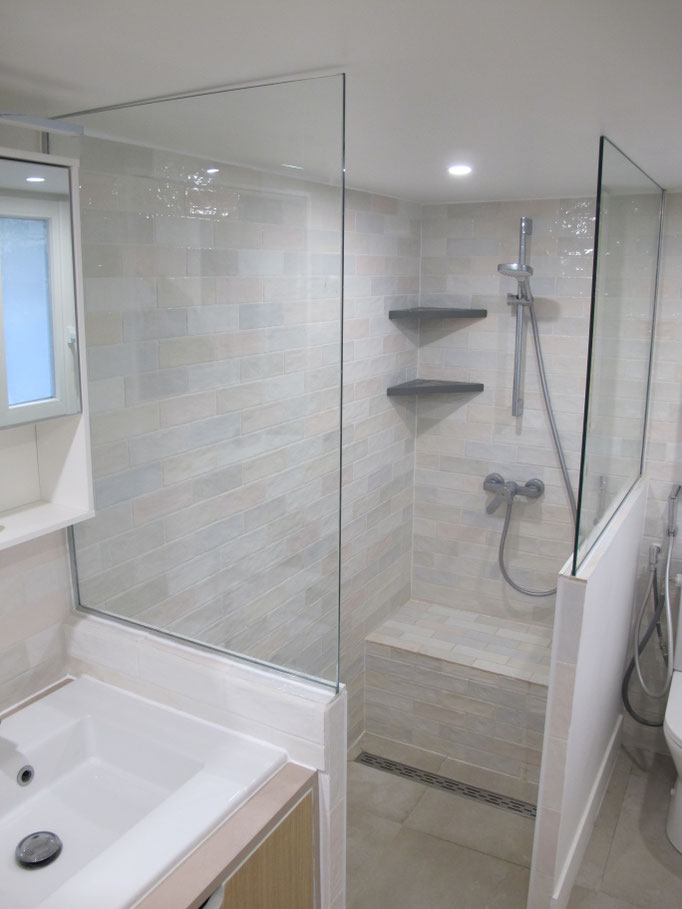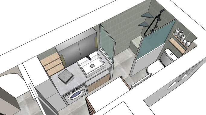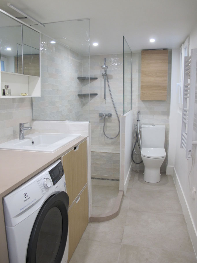 Les propriétaires souhaitaient se débarrasser de la baignoire, au profit d'une douche à l'italienne (chose réalisable car dans une maison). La pièce a été agrandit afin de faire entrer la partie buanderie dans l'espace salle de bain. Le tout a été pensé dans un souci de gain d'espace et de luminosité.