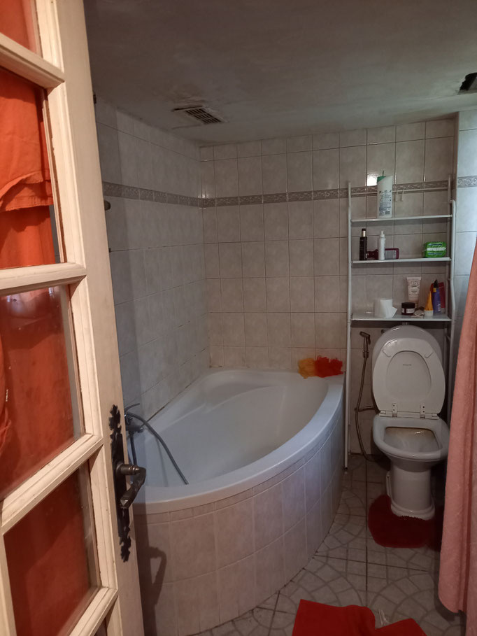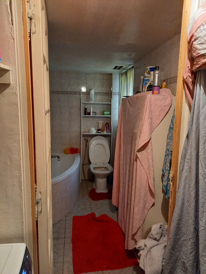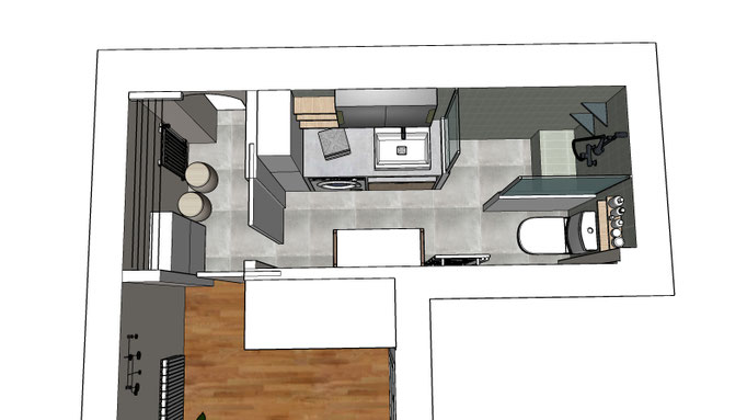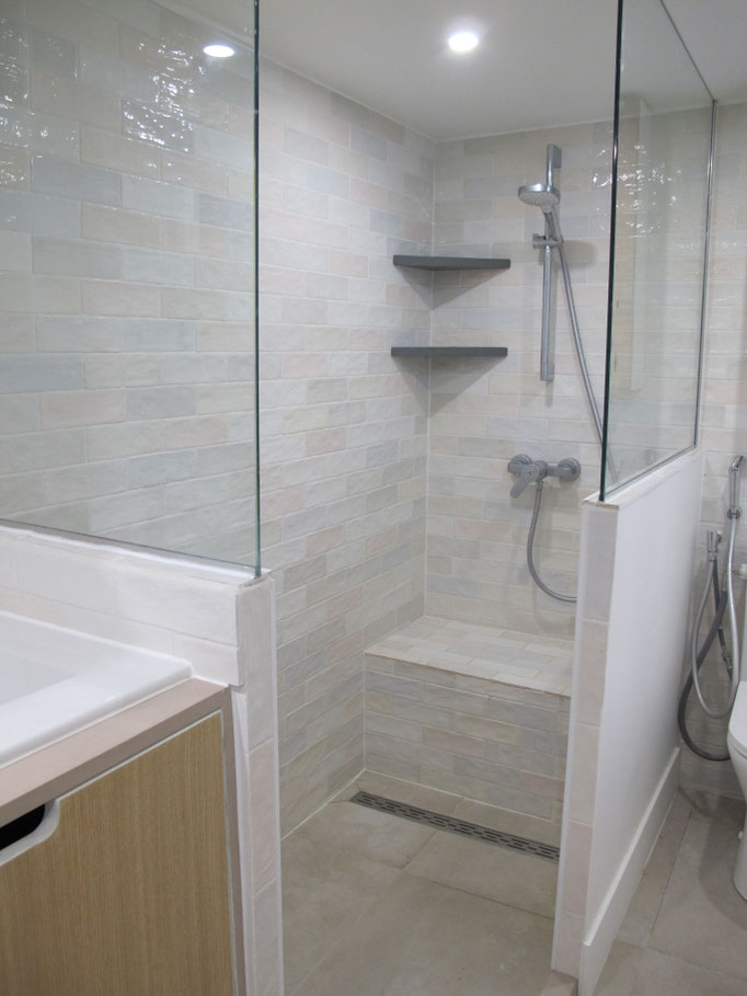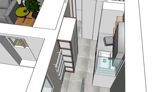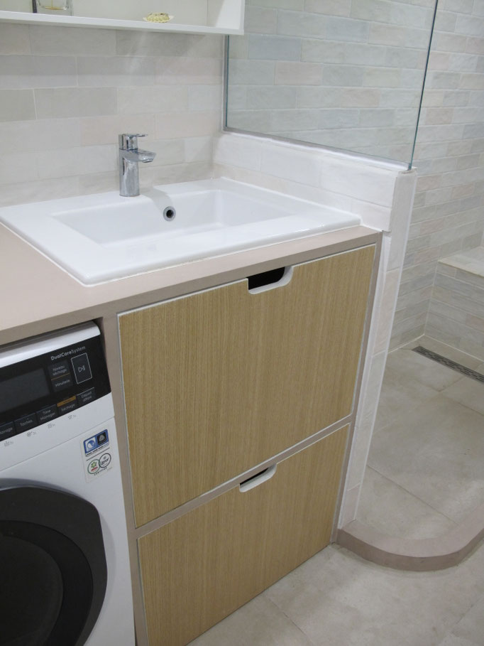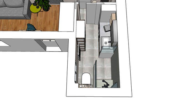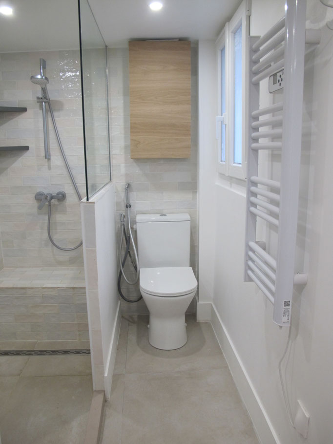 Les propriétaires souhaitaient se débarrasser de la baignoire, au profit d'une douche à l'italienne (chose réalisable car dans une maison). La pièce a été agrandit afin de faire entrer la partie buanderie dans l'espace salle de bain. Le tout a été pensé dans un souci de gain d'espace et de luminosité.