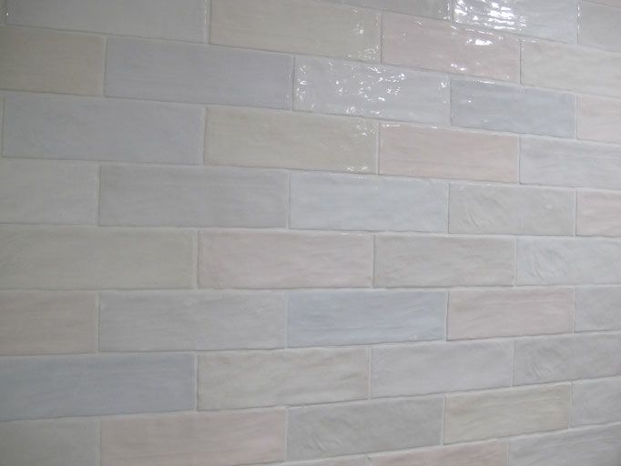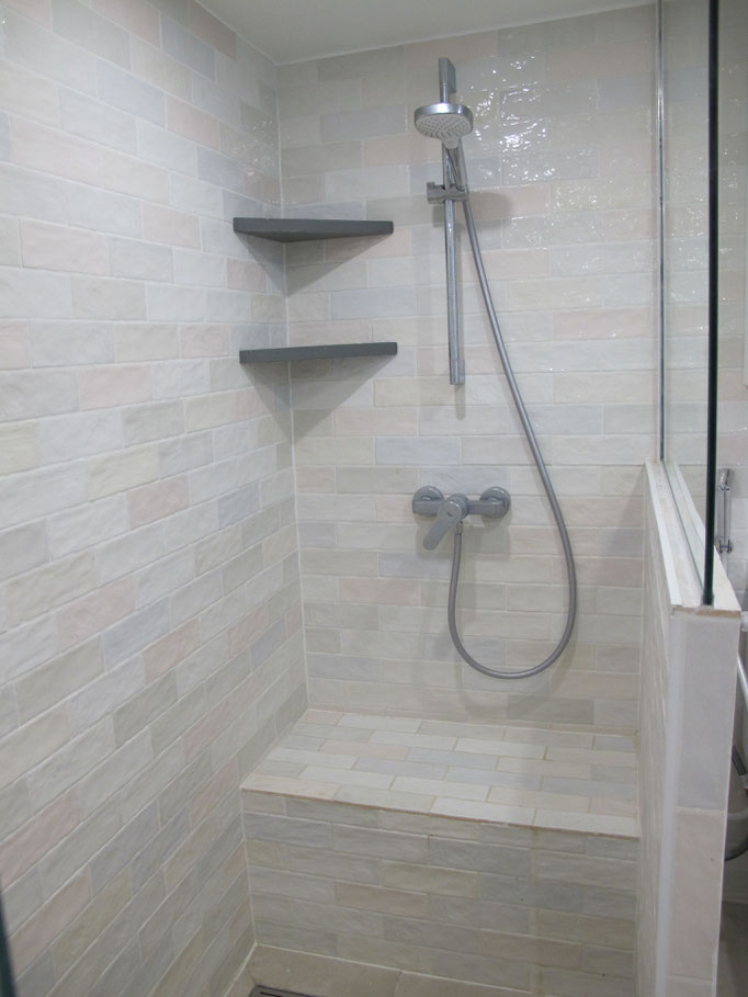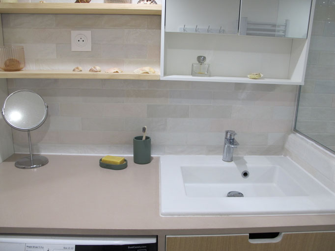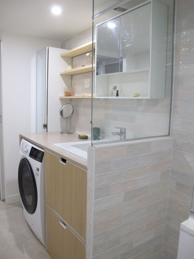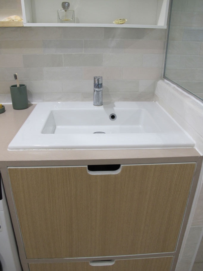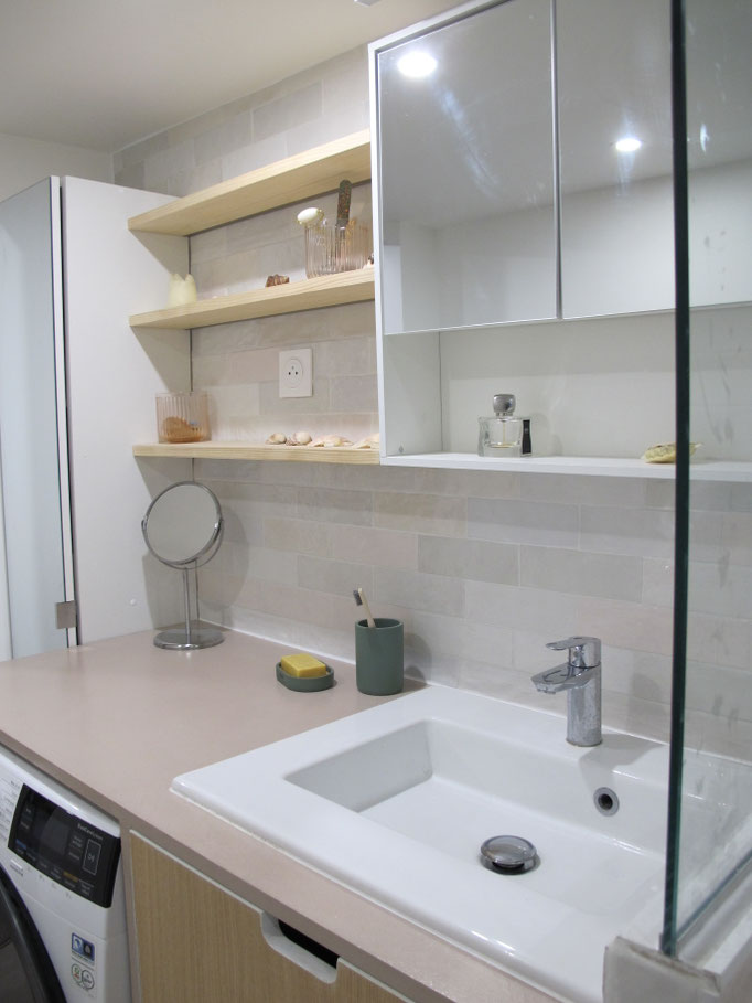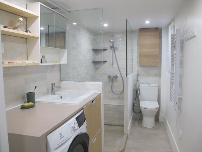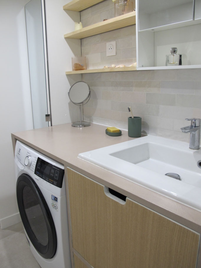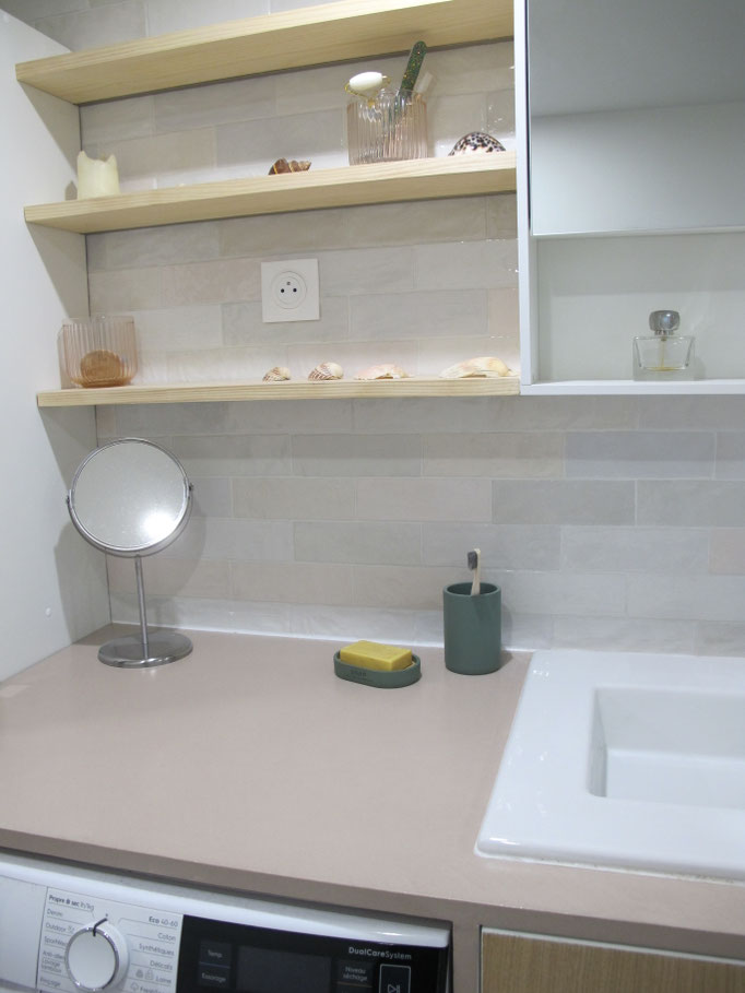 Afin de créer le plus de lumière possible, le carrelage du sol et des murs sont dans des tons très clairs. Les carreaux effet zellige reflète le moindre raie de luminosité. Le meuble de la salle de bain a été dessiné sur mesure, pour intégrer le lave linge et la vasque, avec des rangements. Le tout est recouvert d'un béton rosé pour rehausser la couleur du carrelage mural.