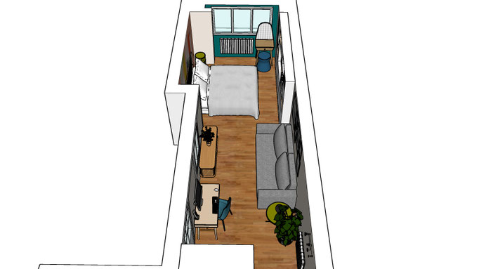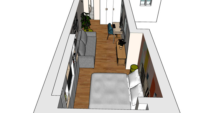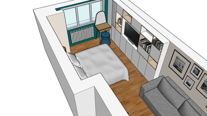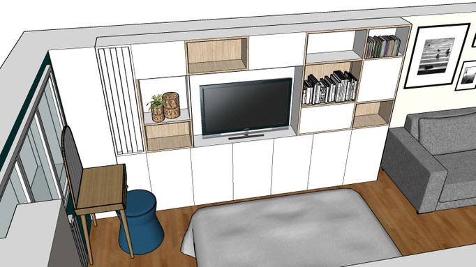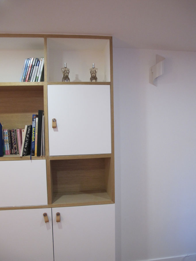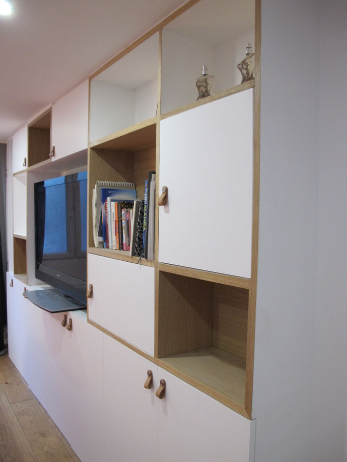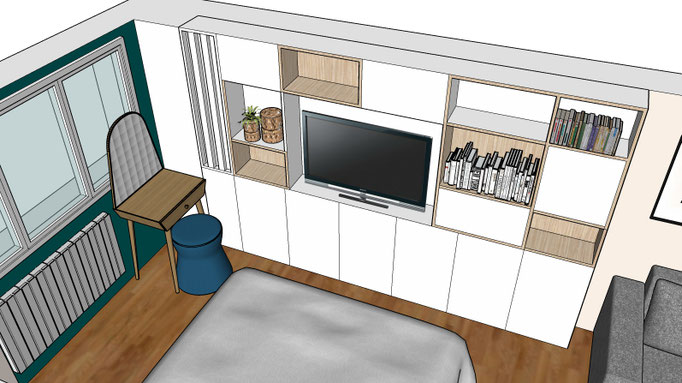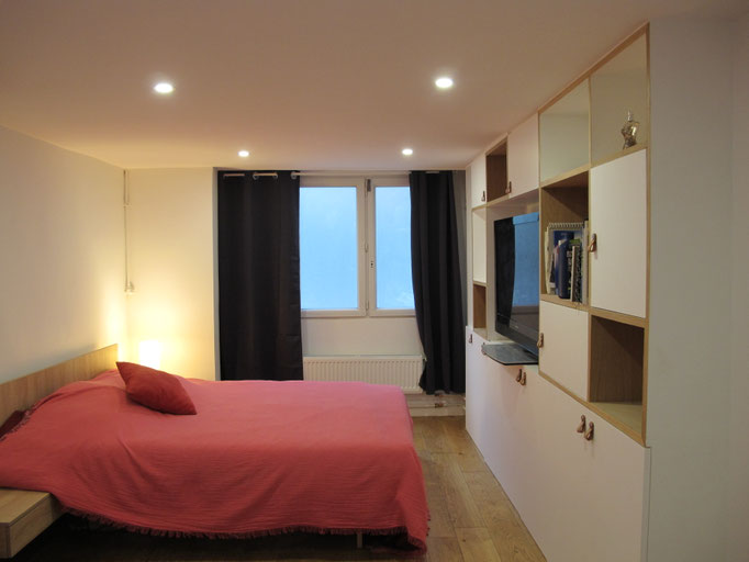 Dans la chambre, deux meubles sur mesure ont été imaginés. L'un sert de dressing, l'autre de rangements divers et accueille la télévision. Le tout a été peint en blanc, toujours dans un souci de luminosité. Avec, la aussi, des touches de bois pour dynamiser la pièce.